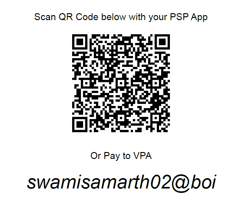 त्वरित देणगी देण्यासाठी वर दिलेला क्यूआर कोड वर तुम्ही तुमच्या PhonePe, GPay, PayTM किंवा इतर कुठल्याही UPI app ने पेमेंट केले असता तुम्हाला तुमचे नाव आणि रक्कम संहित तुमच्या मोबाइल नंबर वर देणगी पावती भेटेल.